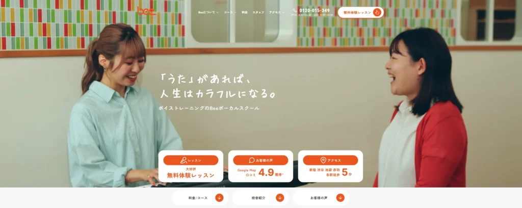 | Beeボーカルスクール新宿校 | 12,936円 | 6,468円 | 60分 | 11,000円(キャンペーン中無料) | 込み | JR新宿駅南口から徒歩3分 |